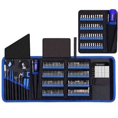 Tai universalus atsuktuvų rinkinys, kurį sudaro profesionalus 120 vnt. tikslių antgalių rinkinys ir papildomas 44 vnt. 1/4" sriegio saugiųjų antgalių rinkinys, kartu su kitais elektronikos remonto įrankiais.